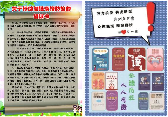 街道社區和集團印發了《新冠肺炎防控知識手冊》、《關于持續加強疫情防控的倡議書》等宣傳手冊、宣傳頁,對新型冠狀病毒感染的肺炎的相關知識進行了答疑解惑。目前我國疫情防控形勢持續好轉,但疫情尚未解除,現階段境外輸入日益加劇,疫情防控不容麻痹松懈,提醒居民出入務必佩戴好口罩,做好個人防護,如有省外返濟或境外旅居史的要及時上報。