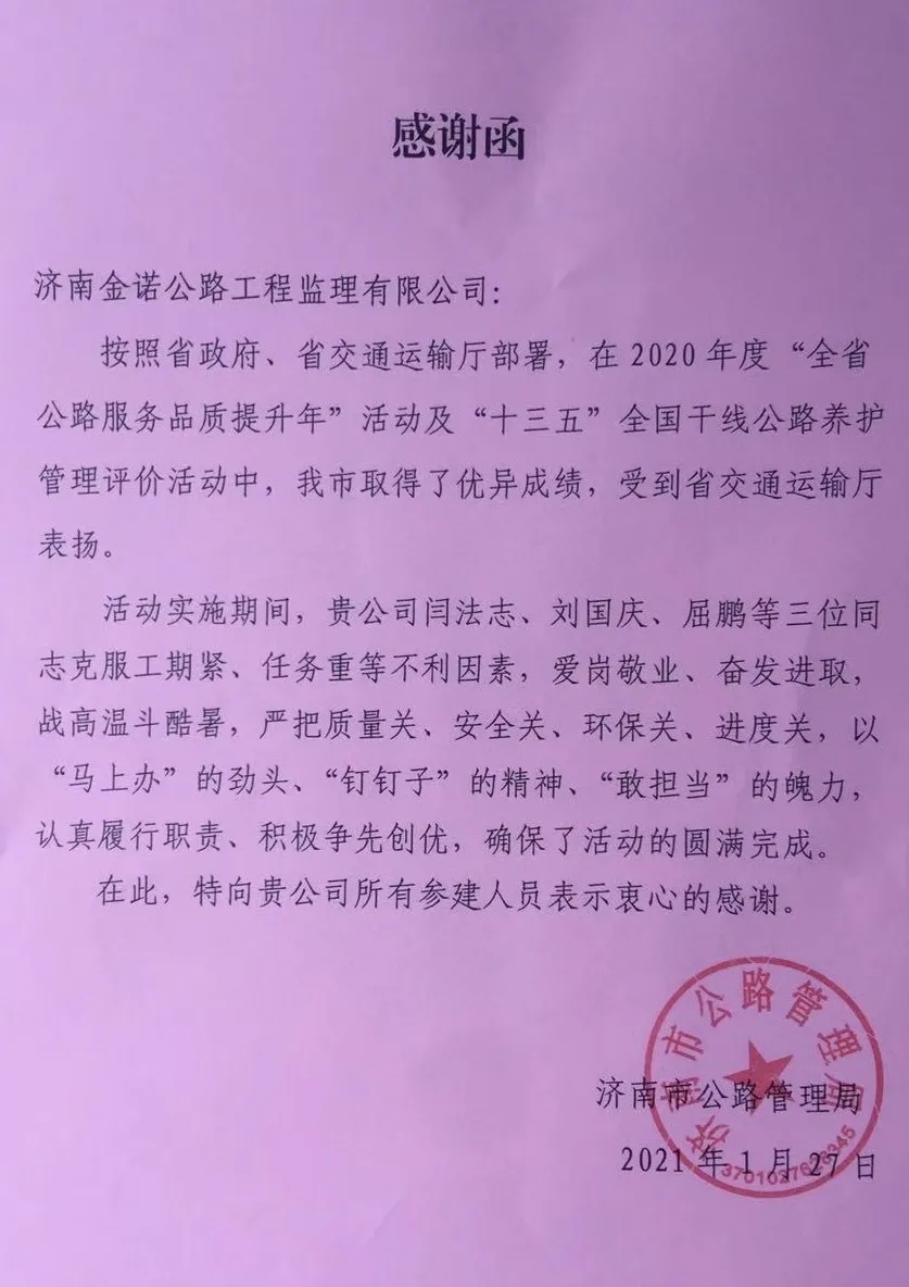 近日,濟南市公路管理局向金諾公司發來了《感謝函》,向金諾公司所有參建人員在2020年度“全省公路服務品質提升年”活動及“十三五”全國干線公路養護管理評價活動中,認真履行職責、積極爭先創優的工作作風表示感謝。