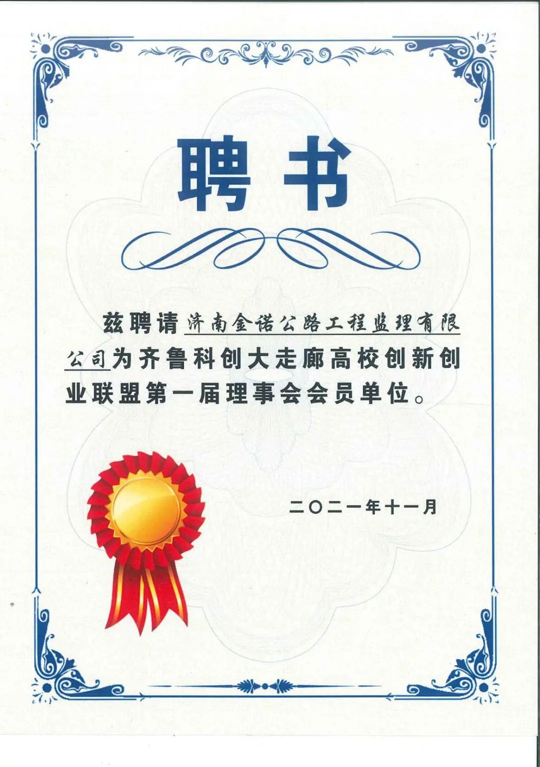 近日,齊魯科創大走廊高校創新創業聯盟成立大會在山東青年政治學院召開,濟南金諾公路工程監理有限公司當選為第一屆理事會會員單位。