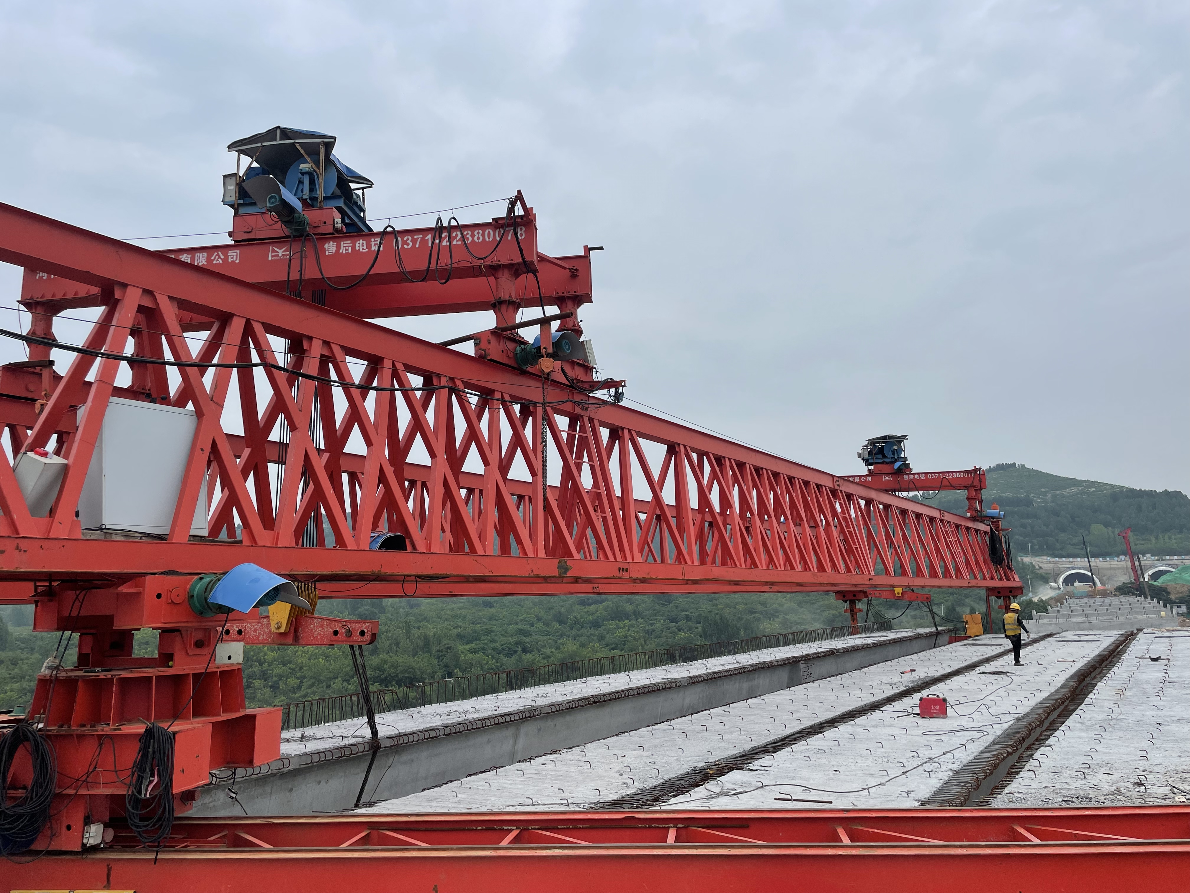 為確保既定目標的順利完成,金曰公司從架梁方案制定、運梁路線選擇、前后場指揮調度等各個環節進行了詳盡周密的部署,增加運梁車數量,提前將待架梁板運至現場,做到“梁板排隊等橋機”,實現每天完成一跨梁板架設的目標。
