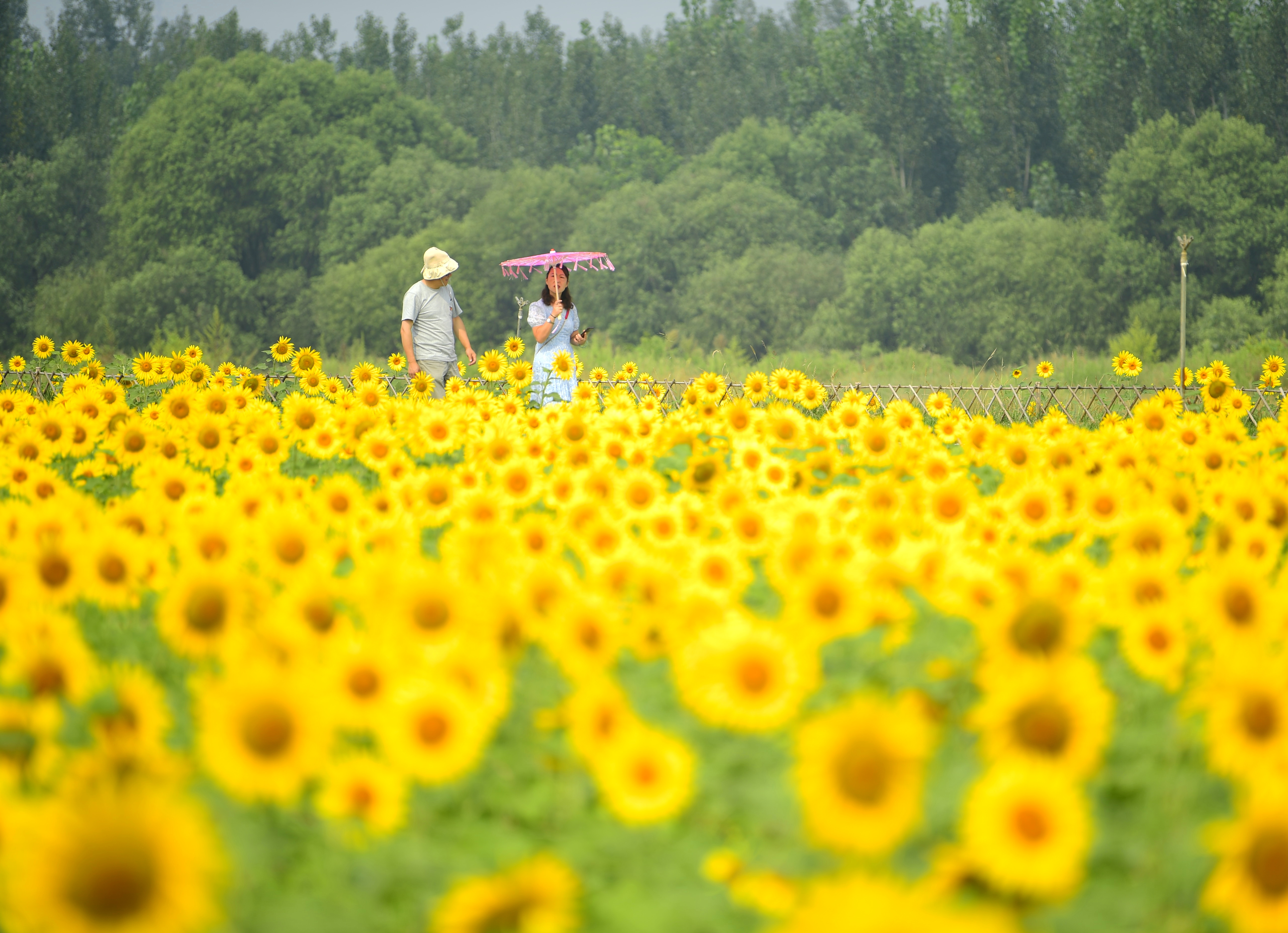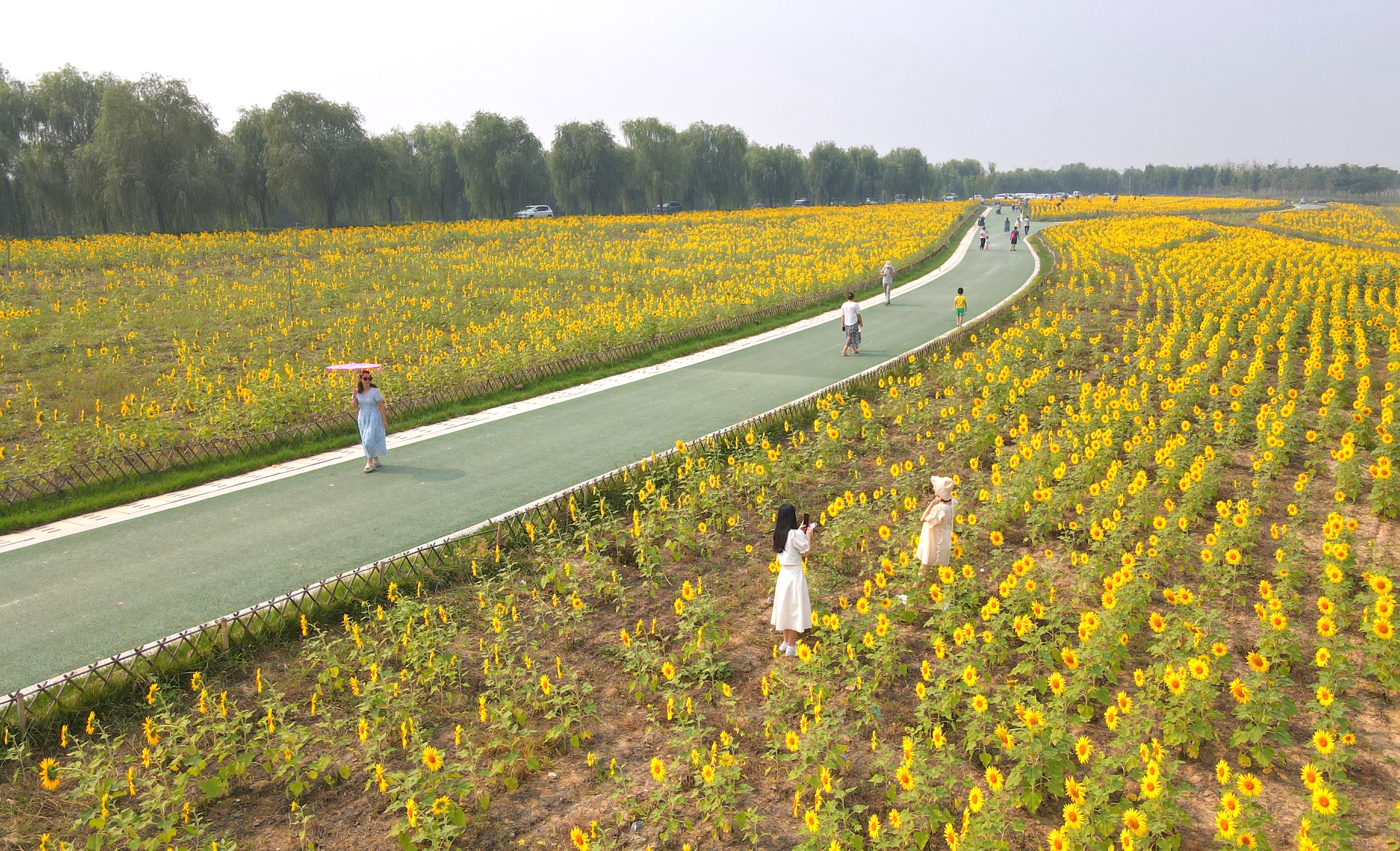 起步區黃河生態景觀風貌帶示范區的鵲華秋色園內,上萬平米的葵花競相開放,橙黃的花蕊,金黃的花瓣,碩大的花盤,在翠綠枝葉的映襯下顯得分外明麗動人。不少市民慕名前來,漫步花海、游玩“打卡”。