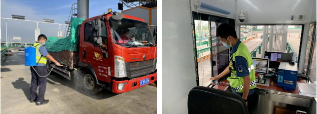 收費員加固防撞桶并對工作現場進行消殺