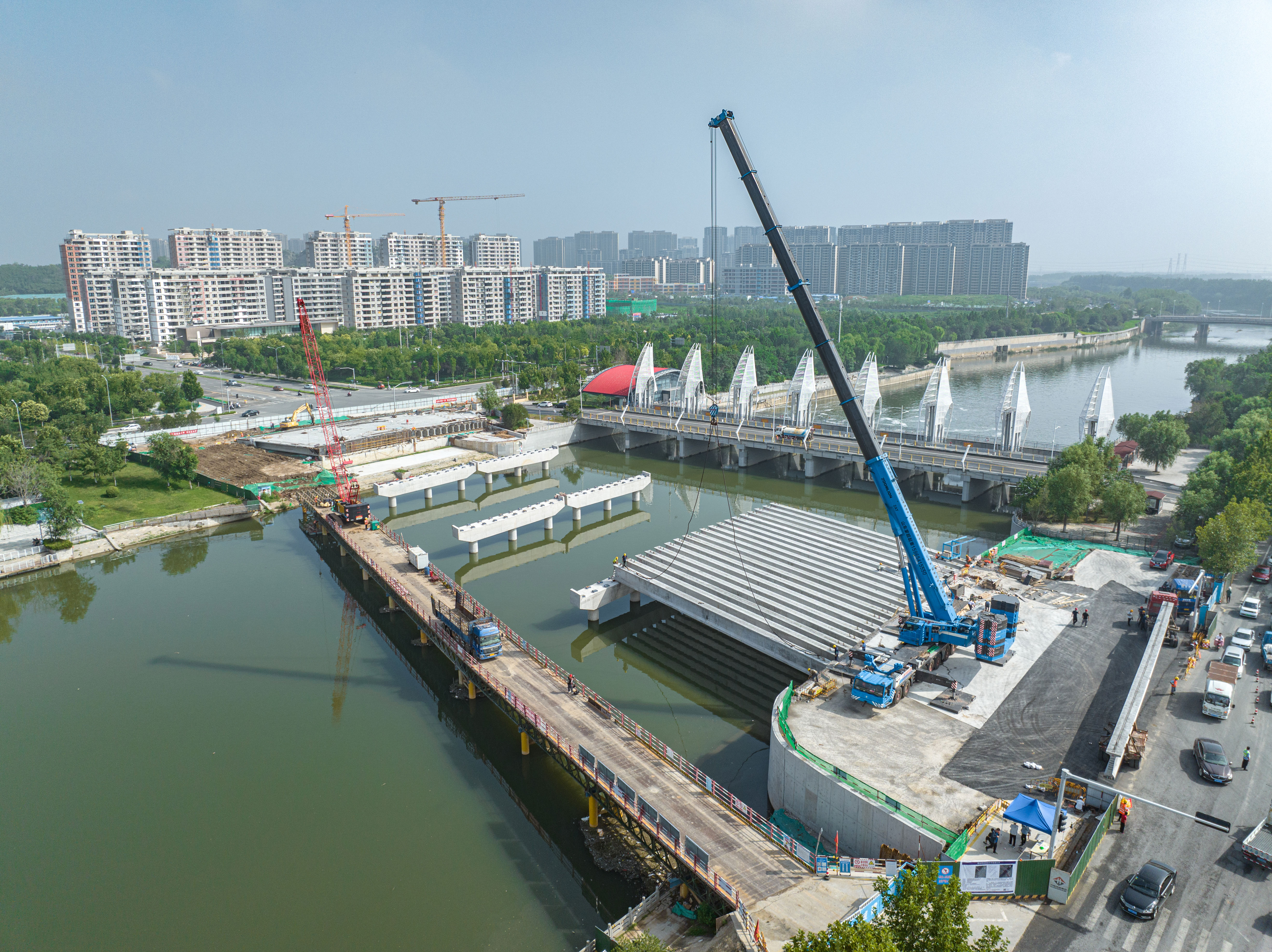 本工程榮獲山東省建設(shè)工程優(yōu)質(zhì)結(jié)構(gòu)獎(jiǎng)。項(xiàng)目在施工過程中采用多項(xiàng)先進(jìn)施工工藝,鉆孔灌注樁應(yīng)用成孔檢測(cè)儀確保大直徑樁基成孔質(zhì)量,應(yīng)用“灌無憂”檢測(cè)設(shè)備,確保樁頭混凝土施工質(zhì)量合格,Ⅰ類樁率100%;蓋梁采用“雙抱箍”無支架模板支撐體系,安全穩(wěn)固,快捷高效;跨河段梁板采用架橋機(jī)吊裝,創(chuàng)新采用“雙支撐矩形”臨時(shí)沙箱支座,確保球形支座上工字梁穩(wěn)定;同時(shí)采用方鋼框架和精軋螺紋鋼對(duì)運(yùn)梁通道進(jìn)行加固,確保梁板逐跨順利架設(shè)。