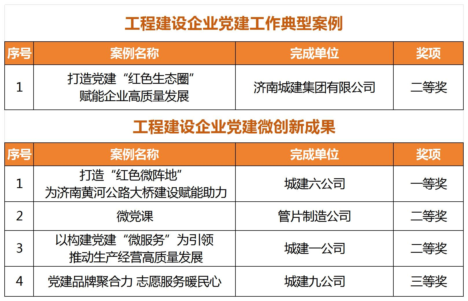 近日,中國施工企業管理協會發布了《關于推廣2024年工程建設企業黨建工作優秀成果的通知》,建設集團所屬濟南城建集團公司《打造黨建“紅色生態圈” 賦能企業高質量發展》黨建工作案例獲評“工程建設企業黨建工作典型案例”二等獎,城建六公司《打造“紅色微陣地 ” 為濟南黃河公路大橋建設賦能助力》、城建一公司《以構建黨建“微服務”為引領 推動生產經營高質量發展》等4項案例分別獲評“工程建設企業黨建工作微創新成果”一、二、三等獎。