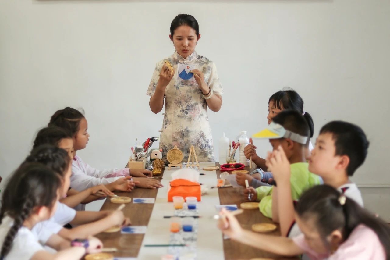 老師帶領(lǐng)小朋友現(xiàn)場體驗(yàn)掐絲琺瑯和水拓團(tuán)扇非遺技藝。孩子們認(rèn)真地完成掐絲、點(diǎn)藍(lán)等步驟,用顏料勾勒出美麗的圖案,不僅體驗(yàn)了手工制作的樂趣,也對非遺技藝有了更直觀的認(rèn)識。