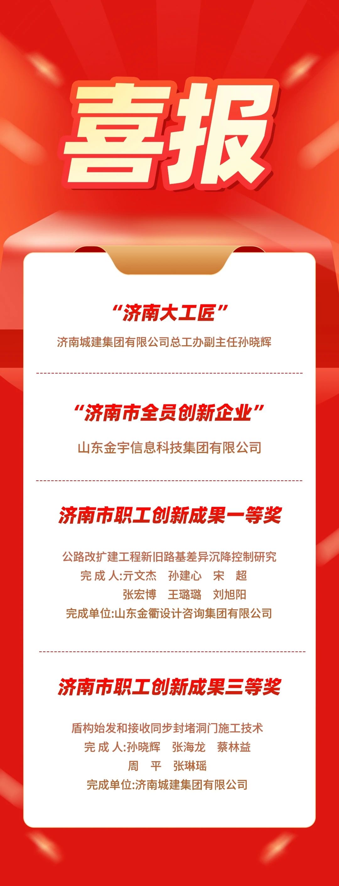 近日,濟南市總工會發布《關于公布2024年度 “濟南工匠”的通知》《關于公布2024年度泉城職工全員創新競賽結果的通知》,建設集團多個集體及個人獲表彰。