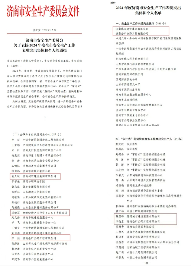近日,濟南市安全生產(chǎn)委員會印發(fā)《關于表揚2024年度全市安全生產(chǎn)工作表現(xiàn)突出集體和個人的通報》,濟南城市建設集團及集團所屬山東金曰交通發(fā)展集團被評為安全生產(chǎn)工作表現(xiàn)突出集體,3名同志被評為安全生產(chǎn)工作表現(xiàn)突出個人,2名同志被評為“審計式”監(jiān)督檢查服務工作表現(xiàn)突出個人。
